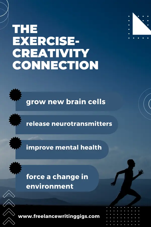 - Releases neurotransmitters: Exercise releases four mood-boosting chemicals—endorphins, serotonin, dopamine, and oxytocin—all of which have an influence on creative thought.
