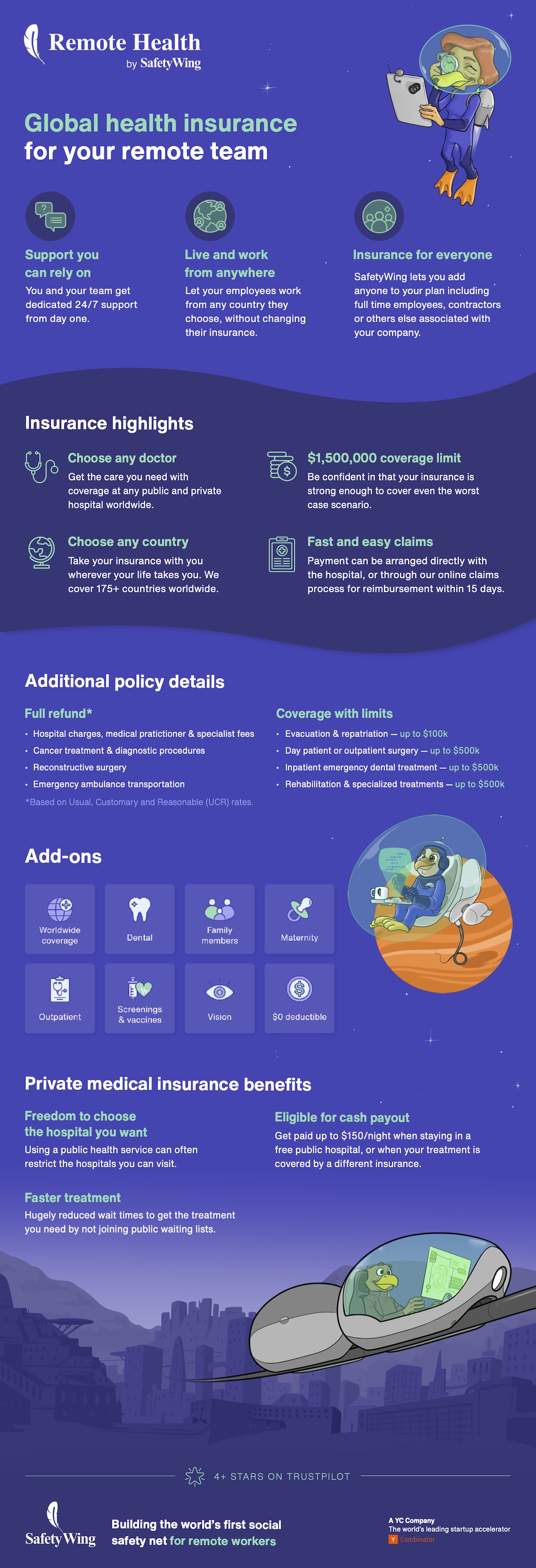 - Coverage includes $1.5M USD for hospital charges per policy year (amongst many more benefits)