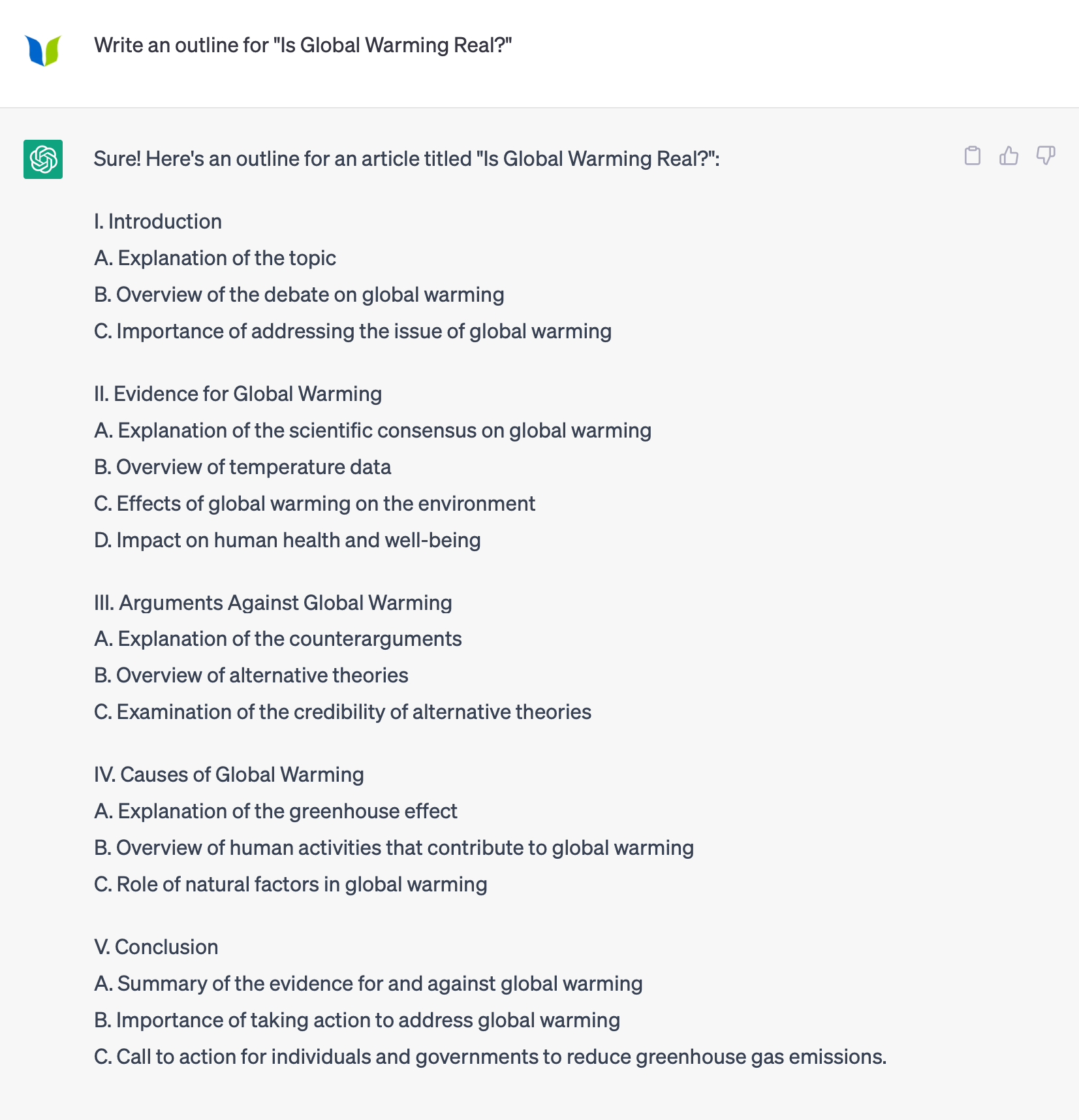 That last part is what I find super useful. Using the global warming example, let’s kickstart the writing process by asking ChatGPT to give an outline for the topic.